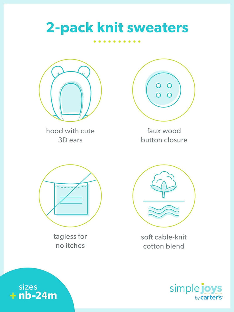 Keep your little one cozy and stylish with the Simple Joys by Carter's 2-Pack Sweater Knit Cardigan—a perfect blend of comfort, warmth, and timeless design. Crafted from ultra-soft, premium sweater knit fabric, these cardigans are thoughtfully designed to provide warmth without compromising on style or ease of wear. Each pack includes two versatile, classic cardigans in complementary colors or patterns, making them a perfect addition to your baby’s wardrobe. Layer them over onesies, dresses, or t-shirts for an effortlessly polished look suitable for any occasion—whether it’s a family gathering, a trip to the park, or a casual day at home.